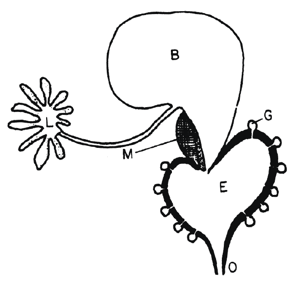 Система защиты жука-бомбардира: B – собирательная полость, E – реакционная камера, G – эктодермальные железы, которые выделяют каталазу, L – секреторные клетки, M – мускул сфинктера, O – выводящий проток. B содержит смесь гидрохинона и пероксида водорода, которую при переходе в E взрывает каталаза