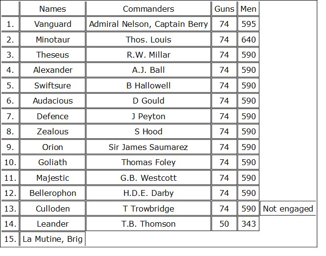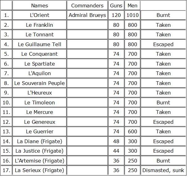 In order to give the reader a better idea of the forces engaged on both sides, we give the following list of ships. It is right, however, to add that one of those belonging to the English (the Culloden) ran aground on a shoal when about to go into action, and took no part in the fight.