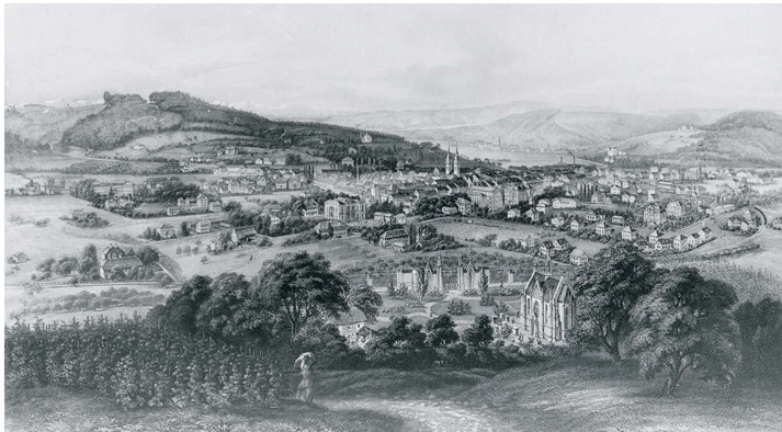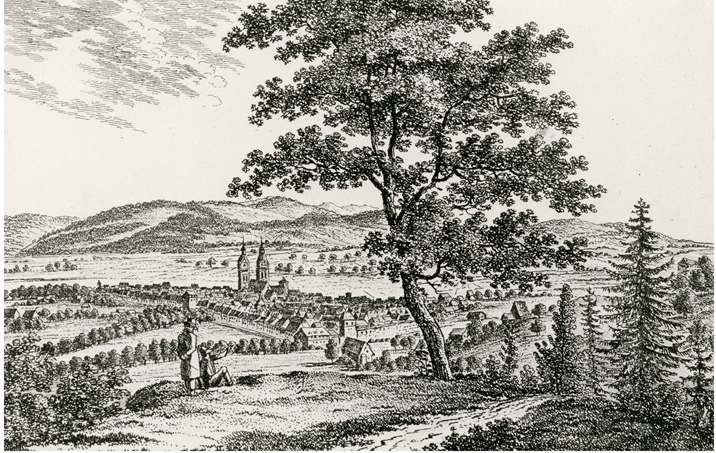 Blick vom Brüelberg auf die noch geschlossene Stadtanlage inmitten von Wiesen und Feldern. Darstellung von Georg Adam (1784–1823), um 1820.