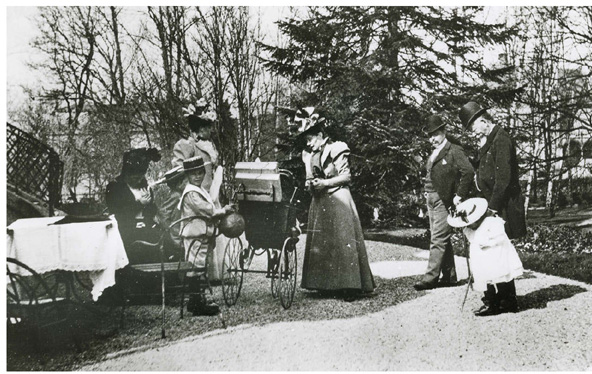 Gemütliche Momente am Fuss der Verandatreppe: Fanny beim Kinderwagen stehend, rechts von ihr Bruder Edy. Foto um 1900.