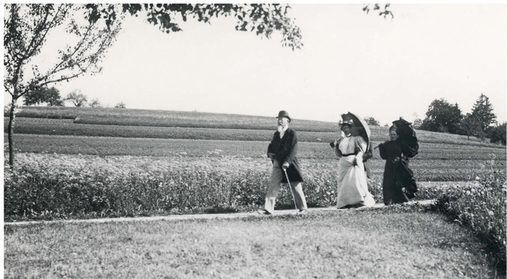 Das Ehepaar Bühler-Egg mit weiss gekleideter Tochter Fanny auf dem Spaziergang. Foto um 1880.