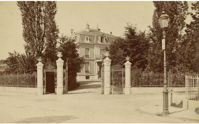 An der Kreuzung von Lind- und St.-Georgen-Strasse öffnet sich, flankiert von hochaufragenden Pappeln, das barockisierende dreiteilige Haupttor. Dahinter führte eine Buchenallee zur etwas erhöht stehenden Villa empor. Foto um 1875. Die meisten der Fotografien aus der Zeit wurden von Johann Linck (1831–1900) oder seinem Sohn Hermann (1866–1938) gemacht. Die Lincks waren während dreier Generationen die Salonfotografen des Winterthurer und Zürcher Bürgertums.