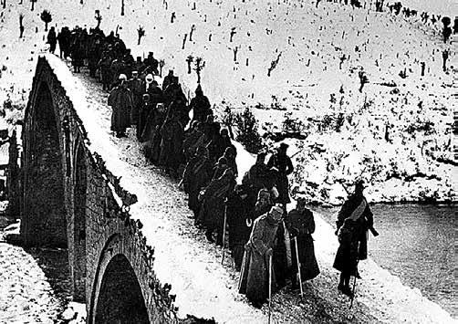 Албанская Голгофа. 71-летний король Пётр I переходит через р. Дрин в Албании во время отступления сербской армии. Декабрь 1915