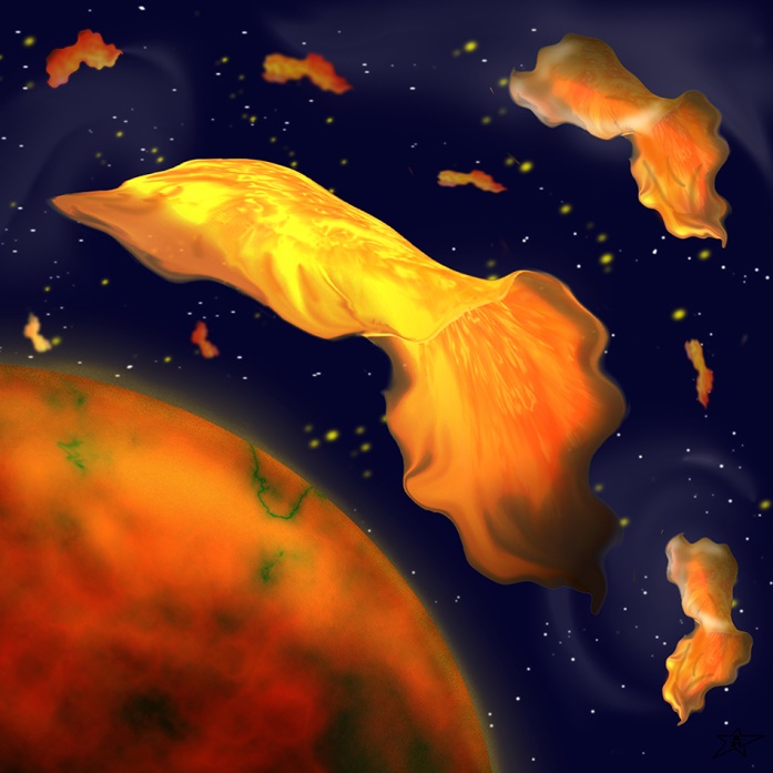 Однако долго петь мне не пришлось. Золотистая полупрозрачная пелена вдруг закрыла черное небо в обзорном окне, и пультовую залило нежным золотистым светом. Овальное полотнище длиной метров десять, изгибаясь, как знамя на ветру, скользнуло мимо станции, а за ним следом пролетели еще с полдесятка таких же знамен. Золотые искры пробегали по ним, когда они изгибались и вились на лету. Полупрозрачные края полотнищ, испускали яркий золотистый свет. К центру овалы становились плотнее, толще, и переливались всеми оттенками золота и бронзы. Долонаны при их приближении задергали рожками так, будто рядом с ними заработал стокиловаттный электродвигатель – электроэнергия на Вите была во всем, и в живых существах тоже.