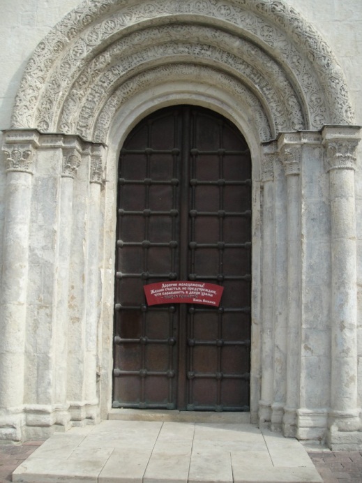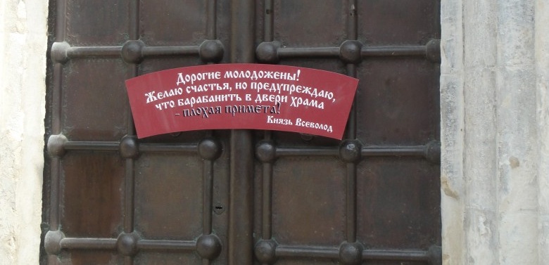 Не менее славным городом Владимиром когда-то правил князь Всеволод Большое Гнездо. Правил благополучно, в числе прочего благополучия – имел двенадцать детей и построил красивейший Дмитриевский собор. Поэтому во Владимире с недавних пор принято во время свадьбы прикоснуться молодым к дверям Дмитриевского собора – чтоб детей было много. Прикасаются, должно быть, с энтузиазмом. Поэтому появилось вот такое объявление.