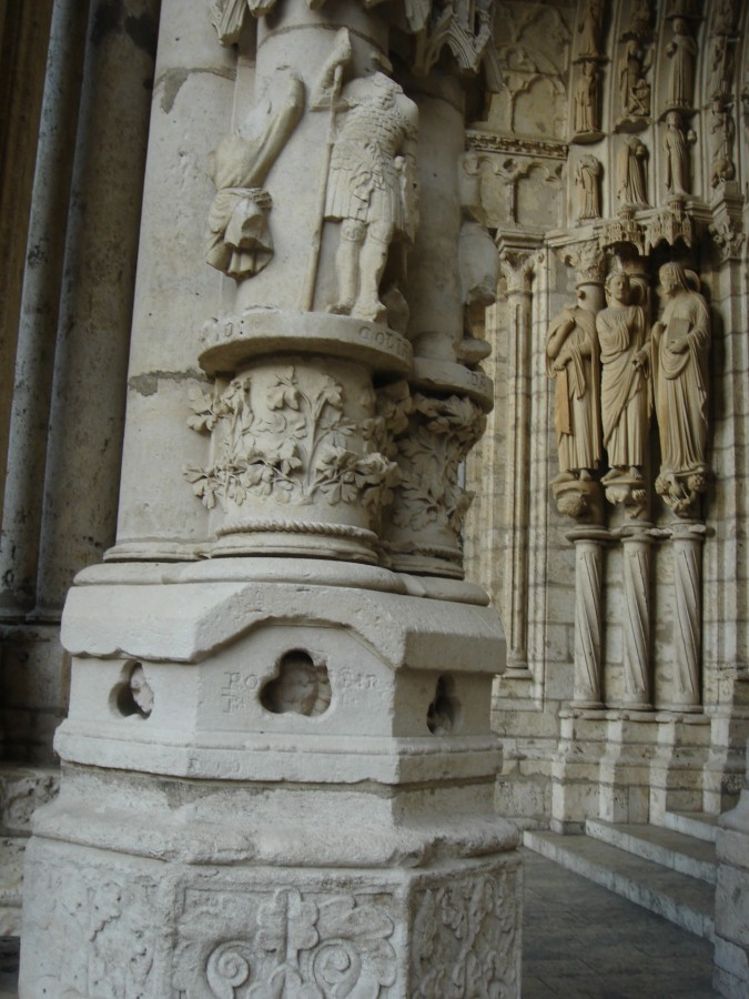 Но вот в Шартре, на знаменитом соборе, я видела совсем других химер. Все у них не как положено. И не на карнизе они сидят, и не на крыше, и не на башне, а наоборот – в темноватых углублениях в основании одной из колонн, стоящих по фасаду. Только одной, с южной стороны.