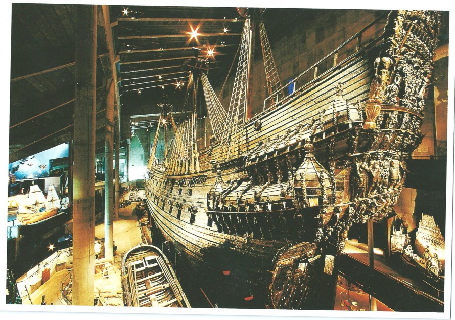 Стоит он, такой большой, красивый, резной и золоченый, в полутемном помещении, с особенным кондиционированием, где туристам не разрешается даже фотографировать его со вспышкой, а уж руками трогать – об этом даже подумать нельзя. Этот снимок – только скан с открытки, для открыток корабль профессионально, с осветительной аппаратурой, снимали только один раз, чтобы это не пошло ему во вред. А все потому, что корабль этот пролежал триста лет под водой, и теперь, если пересохнет на солнце или получит повреждение, спокойно может рассыпаться на куски. А ведь это военный корабль, предназначенный палить из пушек, маневрировать и, между прочим, безопасно возить королей и адмиралов, поскольку строился он как флагман флота Швеции и носил имя основателя тогдашней королевской династии – "Васа".