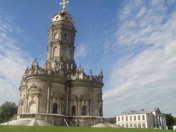 Проходит еще сто лет – и вот князь Борис Голицын получает в подарок от совсем еще молодого Петра Первого поместье Дубровицы недалеко от Москвы. Так же, как Петр, князь Борис любит все новое, чуток к европейской моде, и потому заказывает церковь для нового поместья европейским мастерам. Были они итальянцы или поляки, точно теперь не известно, однако церковь получилась единственная в своем роде. Барокко на основе классического московского храма-четверика.