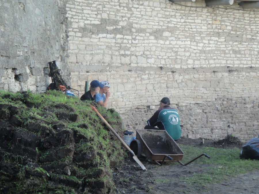 А студентов-археологов что-то не видно, вместо них на другой стороне кремля сидят человек пять весьма аккуратных солидных господ в куртках с названием немецкой фирмы. Аккуратнейше сняли и сложили в ровные стопочки дернину с газона, аккуратно открыли раскоп, но вот чтобы они что-то увлеченно делали в этом раскопе – не видно.
