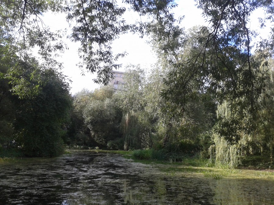 Вот они, и я на них. А старые вётлы сохранились только на противоположном берегу пруда но, конечно, совсем не такие старые и огромные. Но зато пруд остался все таким же тихим и заросшим кувшинками, и ветки ив такие же седые, и зеленые заросли ботанического сада стали с годами еще гуще и зеленее. А над ними…