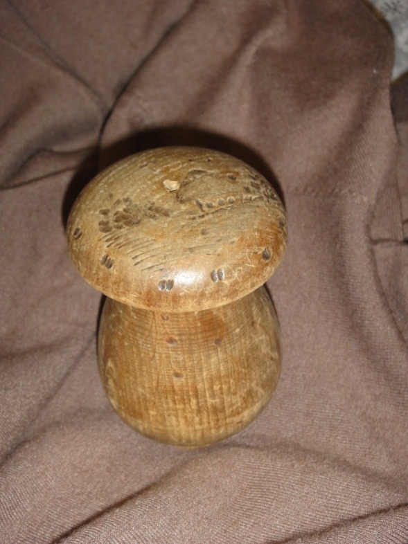Чулки носили хлопковые, штопали на деревянных грибках. Один такой грибок и у меня сохранился, на крышке выжжен пейзаж, на ножке узоры, внутри ножка пустая, можно класть клубочки ниток и иголки. Это грибок моей прабабушки. Вот он на снимке.