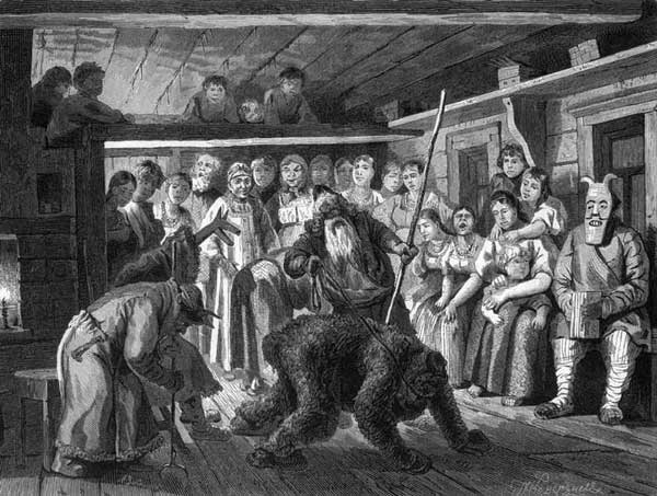 Ну что ж, как говорится, возможны варианты. Например, вот как на другой картинке – медведь танцует, а коза не в шкуре, а в простыне (но в простыне – это неправильно, коза должна быть с шерстью, чтобы встречные могли гладить ее по шерсти, на удачу).
