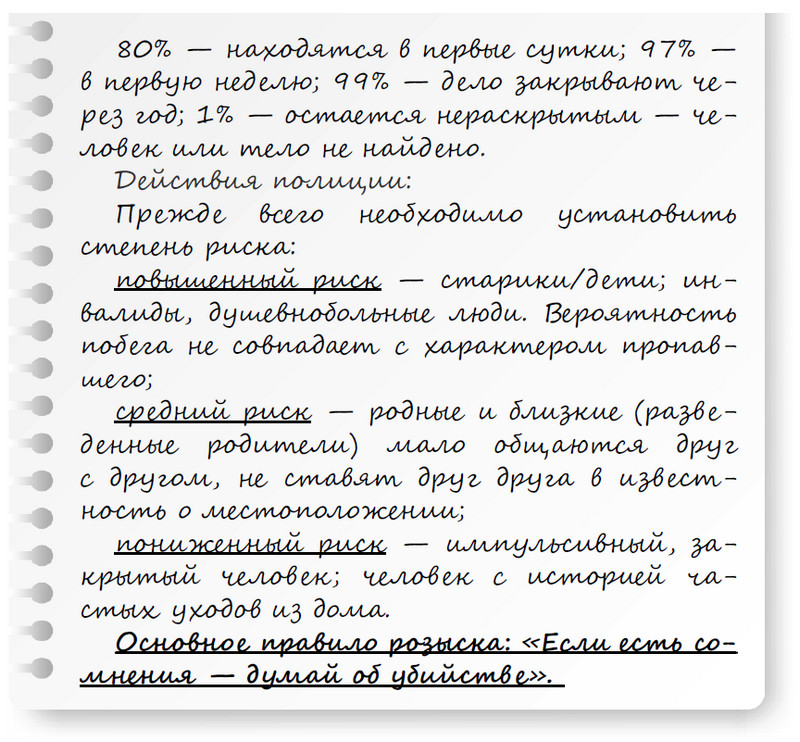 …Имеется ряд признаков, по которым можно сделать вывод, что разыскиваемый пропал в результате совершенного над ним насилия. К таким признакам относятся: