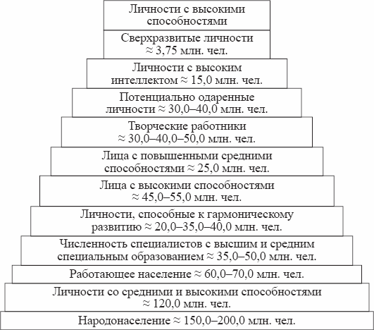 Талантливые личности составляют приблизительно 3 % от населения страны (≈ 4,5 миллиона человек). Обладают коэффициентом интеллекта IQ ≈ 130–140 единиц. Относятся к числу сверхразвитых личностей ≈ 2,5–5,0 % населения, то есть 1 талант на 44 человека народонаселения. А это 3,0–3,75 миллиона человек.