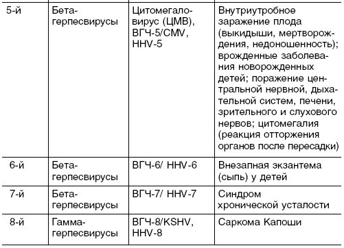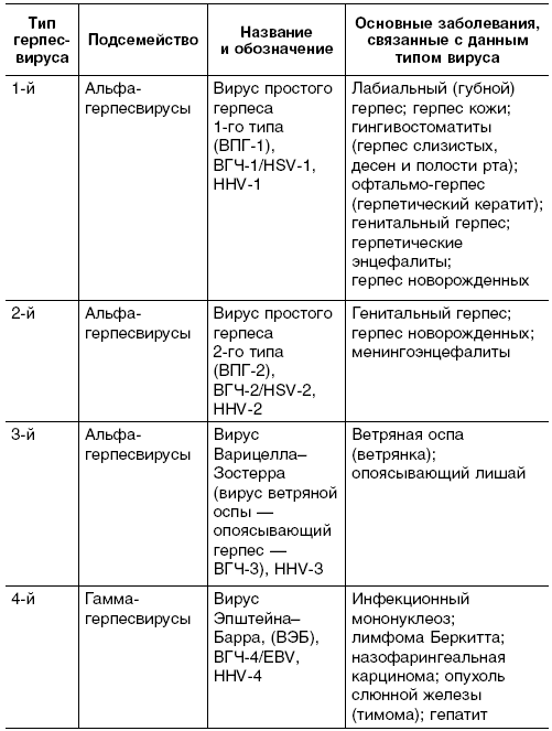 Герпесвирусы объединены в обширное семейство Негpesviridae (от греч. herpes – ползучая болезнь), которое включает более 70 представителей. Из них для человека наибольшую опасность представляют вирусы простого герпеса 1-го и 2-го типов (ВПГ-1, ВПГ-2), вирусы ветряной оспы и опоясывающего герпеса (ВОГ), цитомегаловирус (ЦМВ), вирус Эпштейна-Барра (ВЭБ), вирус герпеса человека 6-го (ВГЧ-6), 7-го (ВГЧ-7) типов. Имеются сообщения об идентификации вируса герпеса человека 8-го типа.