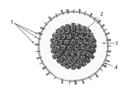 1 – поверхностные белки; 2 – нуклеокапсид; 3 – внутренняя оболочка; 4 – наружная оболочка