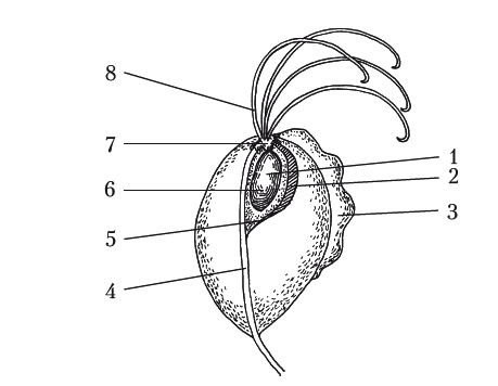 1 – ядрышко; 2 – парабазальный аппарат; 3 – ундулирующая мембрана; 4 – аксостиль; 5 – парабазальная нить; 6 – ядро; 7 – блефаропласт; 8 – передние жгутики