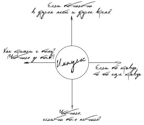 «Мамашу» можно выразить следующим образом. Получив импульс из зала (будь то звук, ситуация, фраза или слово), мы пропускаем его через матрицу, задавая вопросы: