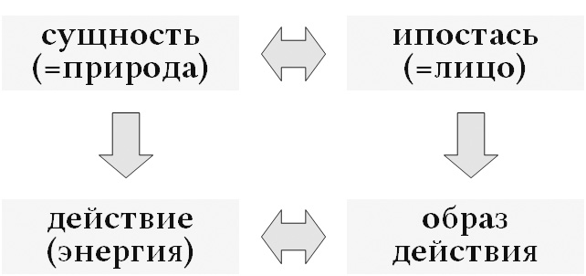 Так, например, представленная типологическая картина исторического проявления образа действия (τρόπος τῆς ἐνέργιας) Лиц Святой Троицы по отношению к миру и человеку может быть осмыслена через взаимное отношение понятий «первообраз» и «образ»[100], где домостроительная прообразовательная связь образа со своим первообразом (отпечатление первообраза в образе), с одной стороны, и возводящее человека познание первообраза через образ, с другой стороны, представляются двумя неразрывными гранями единой реальности[101]. (Следует, однако, заметить, что в отличие от нисходящего вектора, представляющего некоторую онтологическую последовательность, отображённую в домостроительном порядке (Отец, Сын, Святой Дух), восходящий вектор представляет собой исключительно домостроительный компонент[102].)