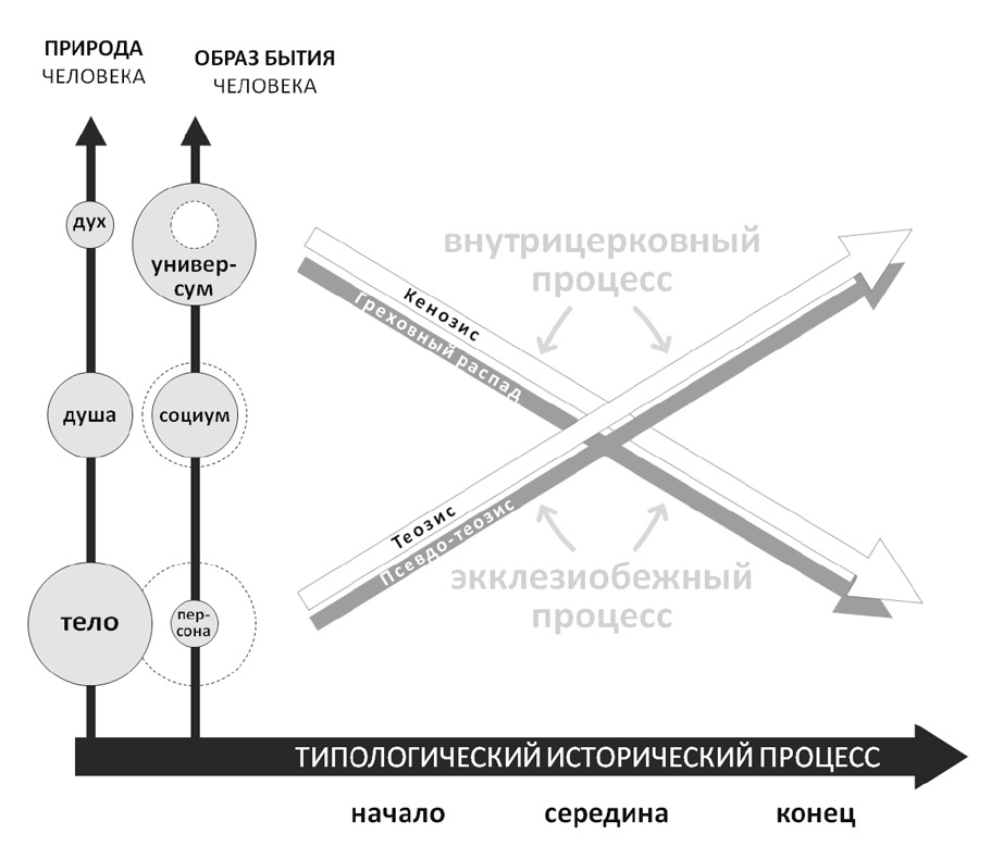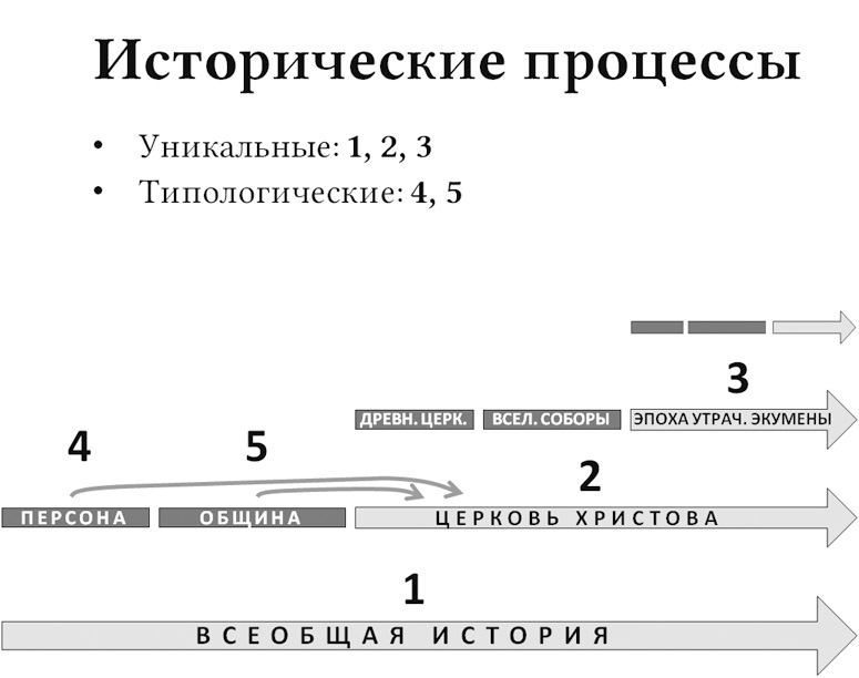 Рассматривая Церковь и мир, мы столкнёмся с проблемой внутренней типологии исторических процессов, протекающих в отдельном человеке или человеческой общности (социуме, общине), т. е. не только с проблемой «вертикальной» типологии, соотносящей Церковь или мир со Христом и Святой Троицей, но и с проблемой «горизонтальной» типологии – поиска общего среди различных персон или различных социумов. Эта проблема состоит в следующем. Образ действия отдельного человека представляет собой, как и сама персона человека, уникальное явление; в определённом смысле эта мысль может быть пролонгирована и на социум. Но что же тогда представляют собой общие характеристики уникального в историческом процессе? Почему они не будут отнесены исключительно к природному (сущностному) плану, что, казалось бы, напрашивается из очевидной аналогии каппадокийского богословия: общее относится к сущности; конкретное / уникальное к ипостаси / лицу?