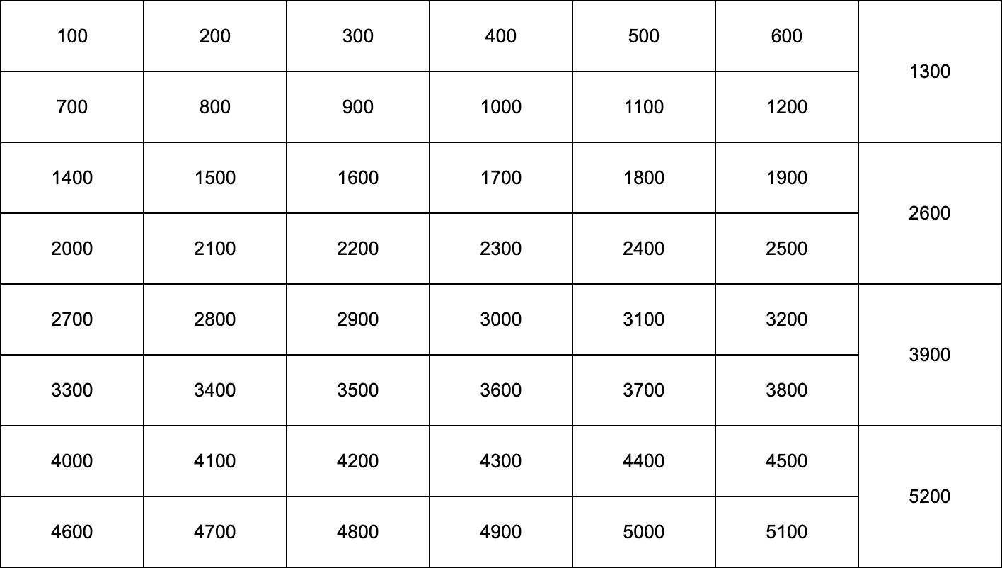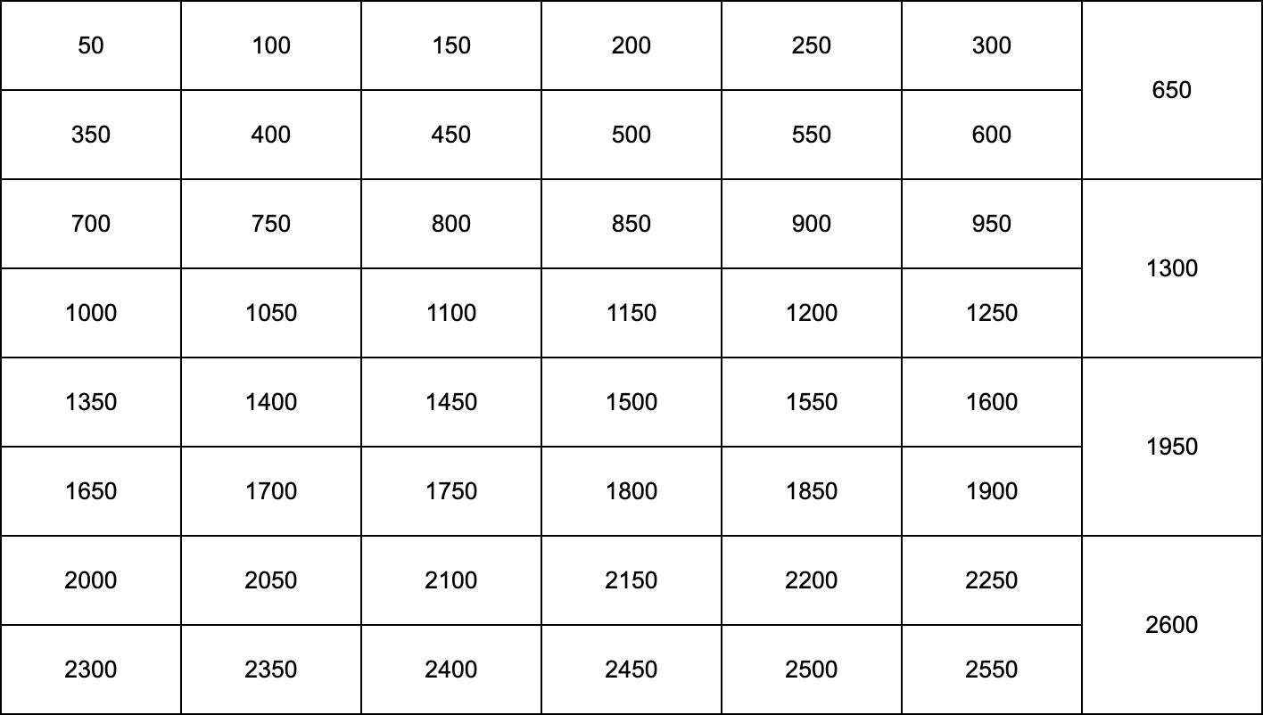 Существует система накопления при которой на протяжении года каждую неделю человек откладывает куда-либо сумму, зачеркивая ее в таблице. Обратите внимание, что каждая сумма в таблице идет с увеличением на 50 рублей. Вот вам таблица для примера: