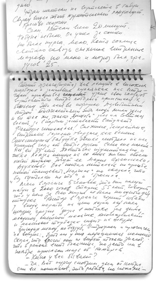 …Первобытный строй! Тысячелетиями эти люди жили здесь, и абсолютно так же(!), разве что «Спидолу» дала им советская власть да в партию велит вступать. Фактура гениальная! Бескрайние снежные, обтертые ветрами барханы, твердые, как камень. Сумасшедшая бабушка, эвенка, смотрела на нас, от пурги прикрыв глаза рукой. Очень маленькая и, хотя ей 89 лет, изумительно пластична и гибка. Каждая мышца на ее лице живет своею особой жизнью. Зовут ее Мария Афанасьевна Адуканова. Она потом пыталась по просьбе нашей танцевать «Наргиле», но сказала, что «Без бутылки не то!», и бросила.