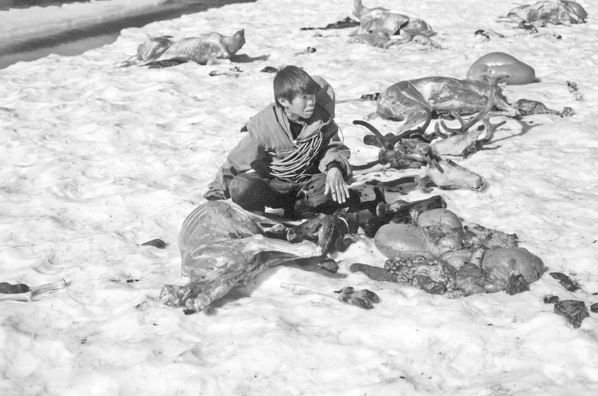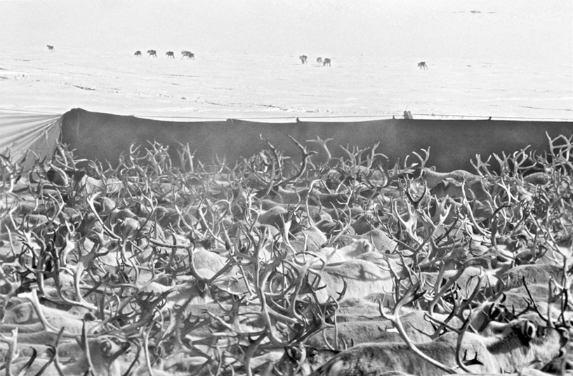Утром уехали на забой. Это жестокое зрелище. Должны забить в этот сезон всего 1500 оленей. На этот раз их было 250. Кораль – огороженный загон-лабиринт, в котором одно отделение от другого отделено черными занавесками. Жутко смотреть, как на ветру, под открытым небом среди снегов и сопок, развеваются черные занавески, между которыми, биясь рогами, мечутся олени. Потом партию штук в 5–7 «отбивают» и загоняют в малый отсек, и там из мелкашки стреляют в упор, в лоб. Олень падает на колени, и его тащат. Взвешивают, затаскивают головой на врытую в землю бочку и перерезают горло. Кровь хлещет в бочку, потом его заносят на этакий эшафот, сколоченный из досок, и «пластуют». Шкуры в одну сторону, мозги в другую, языки в третью и т. д.