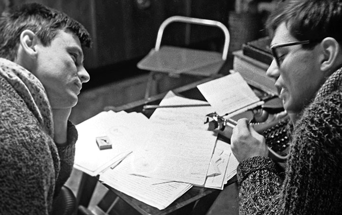 Андрей Тарковский и Андрон Михалков-Кончаловский обсуждают сценарий фильма «Андрей Рублев». 1964 г.