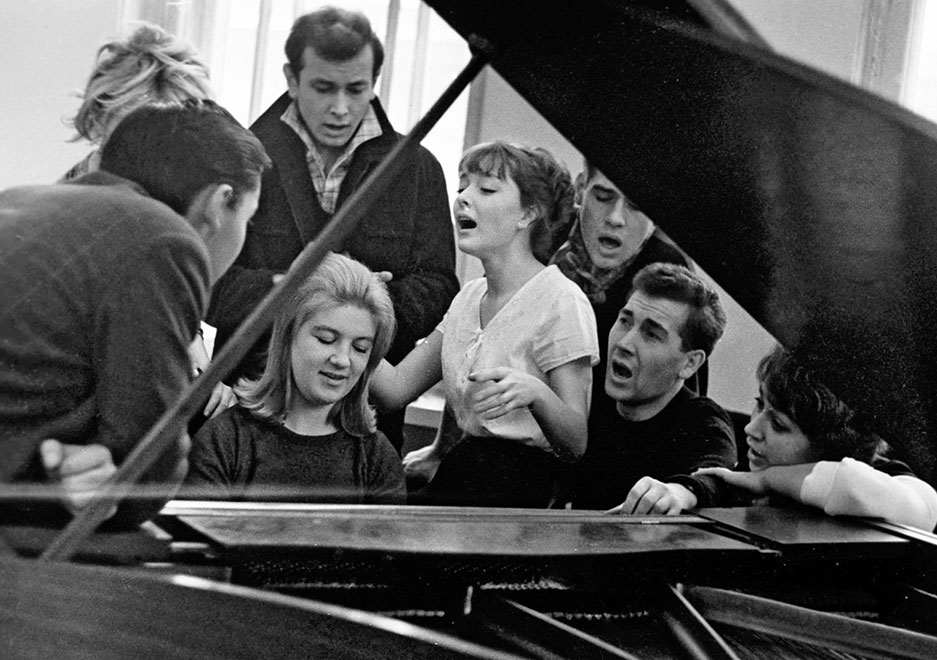 Студентка театрального училища Анастасия Вертинская (в центре) руководит факультетским хором. 1964 г.