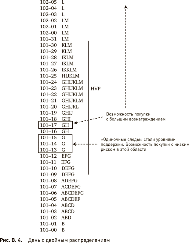 Например, на рис. В. 4 периоды A-F характеризовались узким торговым диапазоном бестрендового типа (минимум располагался от 101–00 до 101–12). В период G рынок ушел вверх, и движение оставило за собой вереницу единичных букв («одиночных следов»), протянувшуюся до нового максимума этого периода 101–24, причем самым низким одиночным следом в этой последовательности явился уровень 101–13.