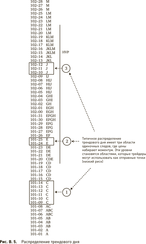 Последним предложенным «Профилем рынка» распределением, которое помогло мне заложить фундамент становления в качестве успешного трейдера, стало распределение трендового дня. Это самое мощное движение рынка, имевшее для меня как трейдера наибольший потенциал прибыли. В распределении трендового дня (оно, по расчетам, должно было происходить в 10 % дней) рынок двигался прямо вверх или вниз, оставляя за собой множество одиночных следов. Рис. В. 5 представляет собой профиль рынка типичного дня с трендовым распределением.