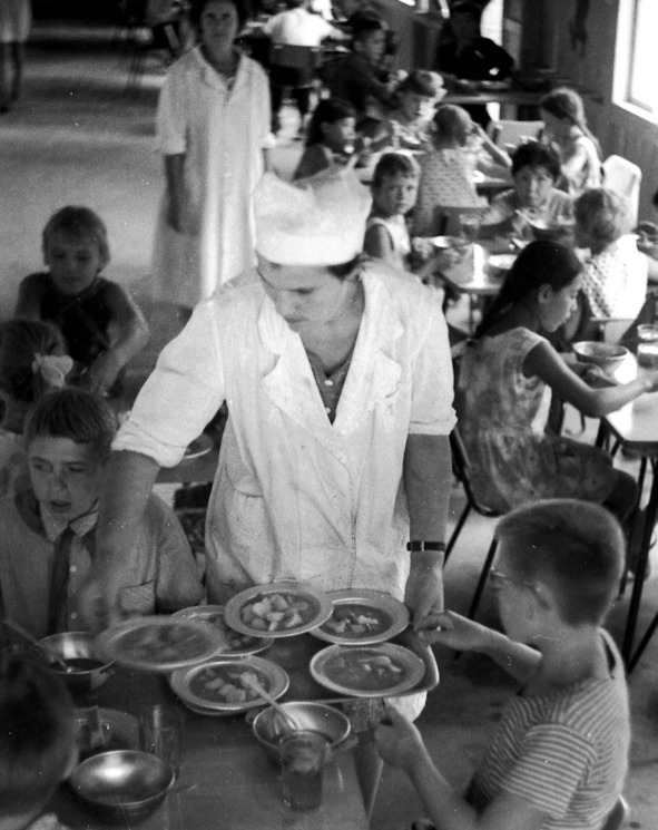 Незабвенно в памяти напряжённое состояние ответственной суеты, сопровождавшее те дежурства по столовой. Отчаянная беготня с полными подносами девчонок в белых колпаках. Шумная орава приходящих строем (с речёвкой!) едоков, моментально переполняющих помещение. Нервный перестук ложек по мискам (то и другое – из чистого алюминия!), ритм которого обречённо угасал к концу яства. И заветно-чарующий голос сверху: «А кому добавки?» И чей-то отчаянный и обречённый фальцет снизу: «А у меня компота нет!». И шумный сдвиг стульев и дружный крик сытых детских голосов: «Спа-си-бо!». И повторение всего ещё раз – для следующей смены.
