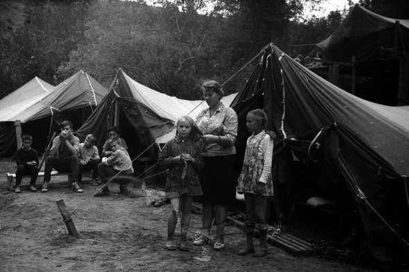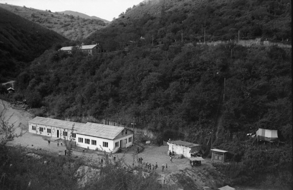 Конец 1960-х. Топография «Кайнара» На переднем плане – столовая. Ниже и правее располагался бассейн, но он в кадр не уместился. Выше, на склоне, жилой корпус для малышей (за ним стояли палатки, а позже – вагончики). Правее – главная площадь (плац, стадион, площадка для игр и т. п.).