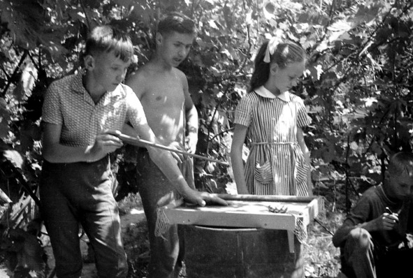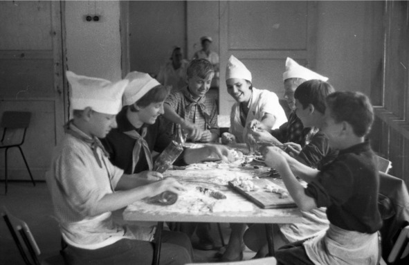 Как свидетельствуют приводимые здесь «кайнаровские» снимки, по крайней мере самые старшие были задействованы в более ответственных операциях, таких, например, как лепка пельменей. Не исключено, что для многих эти пельмени были первыми вылепленными в жизни! Если даже считать, что к обеду в лагере подавалась детская порция из 10 пельмешков (но – крупных!), на ораву в 150 человек их предстояло приготовить полторы тысячи!