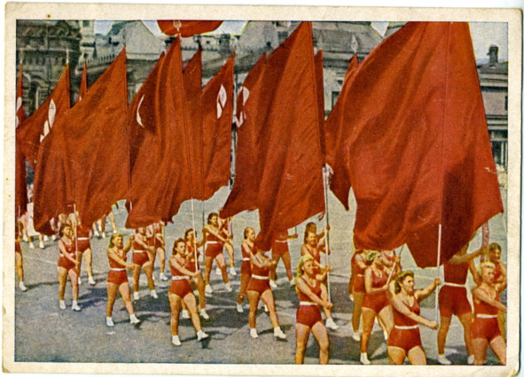 Один из первых послевоенных парадов физкультурников на Красной площади в Москве. Открытка 1946 года.