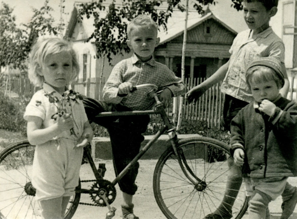 Середина 1960-х. Посёлок. Ребята с улицы Садовой. Автор с сестрой Леной и Саня Екатеринин тоже с сестрой Леной.
