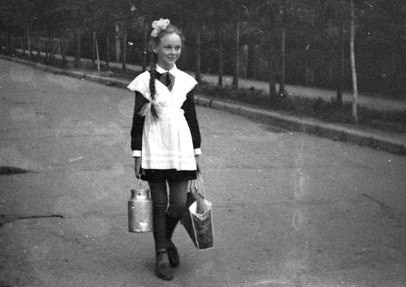А ещё у каждого из нас непременно находились и свои домашние обязанности, круг которых во многом зависел от настойчивости родителей и образа жизни семей. На представленном тут фото – образцовая ученица в школьной форме возвращается из магазина с бидончиком молока. (История даже сохранило нам имя героини – Оля, Ольга Кострица.)
