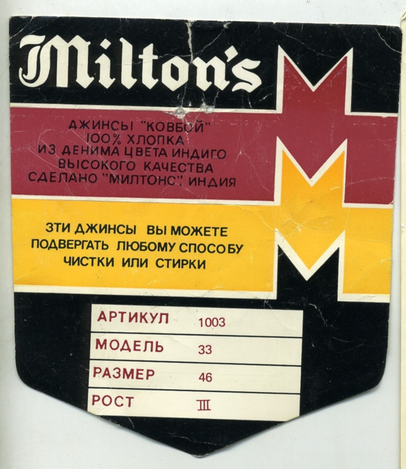 Голубая мечта советского юношества – окрашенные индиго индийские джинсы «Ковбой». Трудно объяснить природу массового психоза обладания, но он имел место. Этикетка 1980-х.