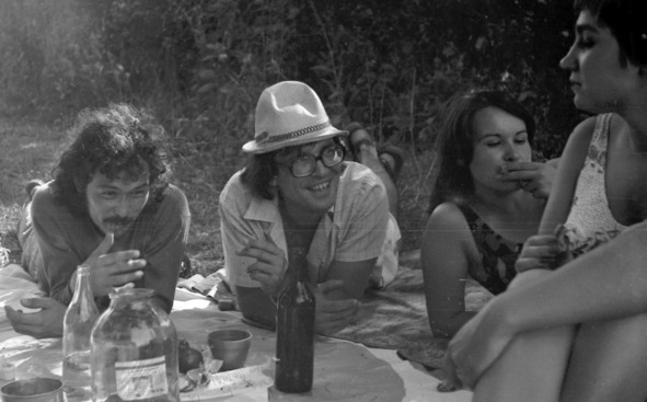 В среде интеллигенции аккуратную стрижку носили только функционеры. Остальные не придавали внешнему виду своих голов особое значение. Главное – наполнение. Молодые физики Арик Исаев и Сергей Вагин имели весьма характерный вид. Как и наши подруги – Ира Черняева и Наташа Ботвина. Фото с пикника 1980 года.