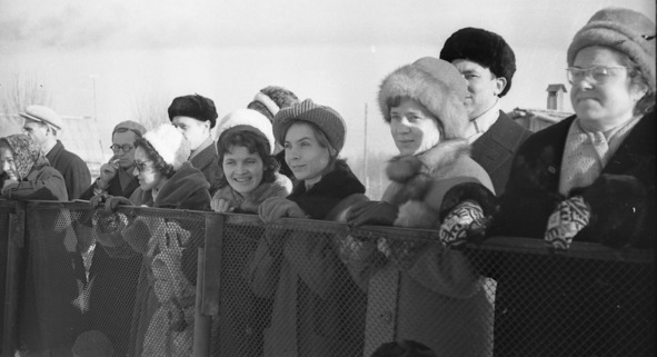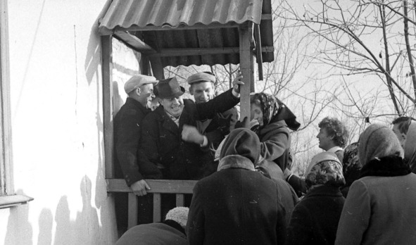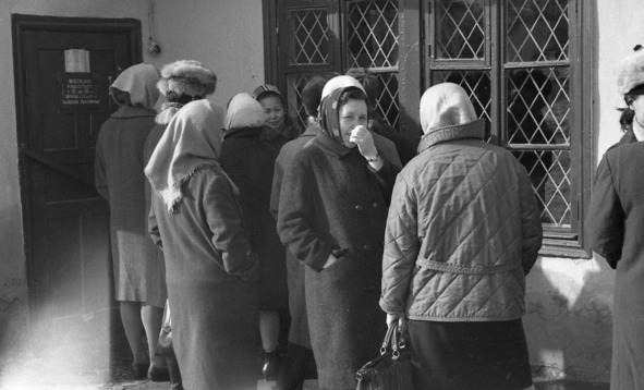 «Рабочая очередь» в наш поселковый хозмаг. Женщины пришли к открытию. На всякий случай. 1960-е.
