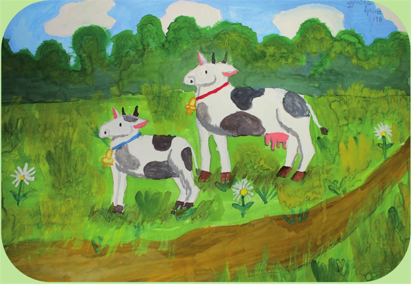 На лугу пасется в стаде,В летней утренней прохладеТравку щиплет и жует,Из ручья воды попьет.Ходит в поле и мычит,И ушами шевелит.Вечером домой вернется,В стойло свое зайдет,«Му-у-у», – хозяев позовет.Мол, идите, подоите,Молоко теперь берите!Будет масло и сырок,Сливки и сметана.Ты чтоб был здоров, дружок,Радовалась мама!