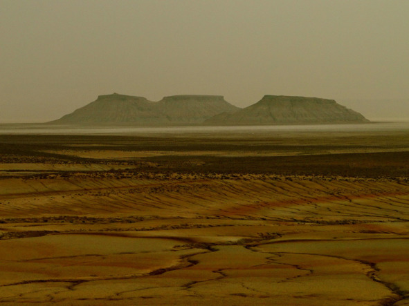 Самая, пожалуй, живописная из местных депрессий – Карынжарык, с её островами-останцами. Знаменитые «Три Богатыря» возвышаются над солёным дном, занятым обширным солончаком Кендирлисор. В иные времена Богатыри отражаются в едком рассоле, словно таинственный остров, на котором обитают чудища, пережившие Потоп. Но летом весь пейзаж растворён в расплаве дрожащих испарений, поднимающихся из чрева адской ямы.