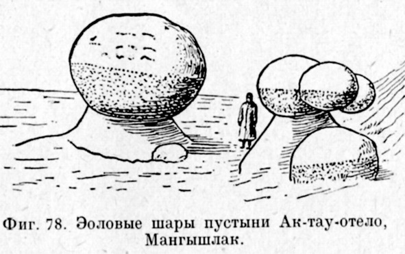 …Жгучим желанием пробраться в самую сердцевину дебрей Мангышлака меня заразил кумир юности – академик Обручев. В его культовом учебнике «Основы геологии» воображение поразили две иллюстрации (по старинке обозначенные как фиг. – «фигуры»), на которых были изображены «эоловые шары и столы пустыни Ак-тау-отело». В главе, посвящённой «разрушителям камней» – всяческим выветриваниям, великий геолог объяснял их происхождение следующим образом: