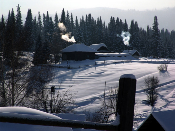 И тусклый зрак солнца, едва пробивающий морозную мглу на рассвете. И взъерепененные печными дымами сёла, многие из которых насчитывают не одну сотню лет истории. И покрытые изморозью пихты, ослепительно сверкающие на солнце своим праздничным нарядом. И огромные сугробы, под которыми обнаруживаются присыпанные домишки сельчан. И уютные дорожки-траншеи, такие глубокие, что из них, кроме полоски голубого неба, и не видно ничего. И туман над Иртышом, в котором мирно плавают оторванные от земли деревья, дома и люди.