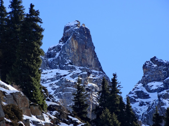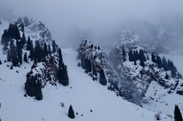 Но зима в Заилийском Алатау хороша в любом состоянии. И для того чтобы проникнуться ею, вовсе не обязательно месить сугробы из свежего снега, который всегда таит в себе опасность образования лавины. Благо, что многие из горных троп на солнцепёках южных склонов всю зиму вообще-то бесснежны и безопасны. И это один из самых лучших вариантов любования зимними горами. Солнышко ласково пригревает тебя своими южными лучами (так, что можно даже загорать!), а напротив, на другом склоне ущелья стоят, завораживая, запорошённые снегом еловые леса. Феерия!