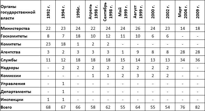Таблица 1.3. Структура федеральных органов исполнительной власти Российской Федерации в период 1992–2009 годов [3]
