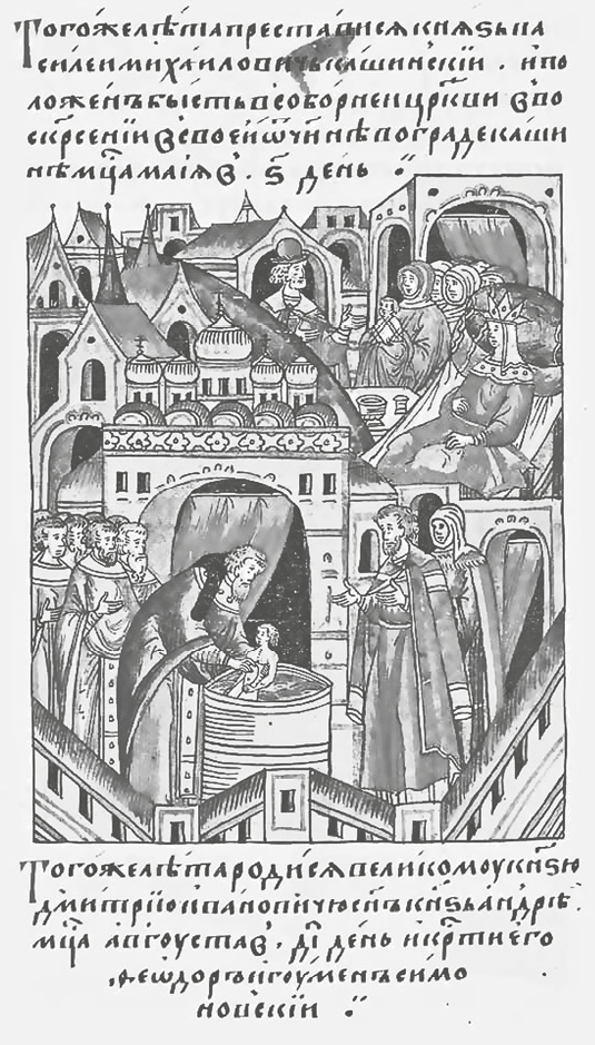 Что касается Василия, то под 1371 г. летописец зафиксировал факт его рождения: «Тое же зимы месяца декабря 30 родися великому князю Дмитрею Ивановичю сынъ Василеи»[15]. На третий день, 1 января 1372 г., младенец был крещен. По тогдашней традиции его назвали Василием в честь Василия Великого, святого IV в., память которого отмечается в этот день.