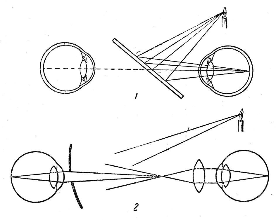 , имеющего плоскую или вогнутую отражательную поверхность с отверстием в центре. Рефракционный офтальмоскоп, кроме того, снабжен приспособление для удержания во время исследования корригирующих линз при определении дальнозоркости или близорукости.
