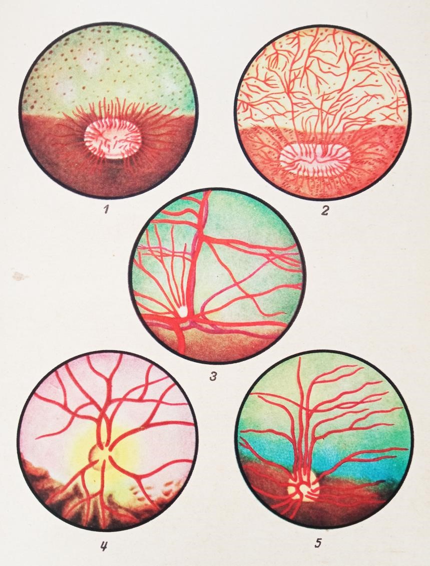 Офтальмологическая картина дна глаза животных различна и специфична для каждого вида. Она характеризуется различной окраской дна глаза. Формой и окраской соска зрительного нерва, его расположением по отношению к отдельным участкам дна, разветвлением сосудов артерии и вены сетчатки, отсутствием у животных некоторых видов слоя tapetum в сосудистой оболочке, что придает дну глаза у этих животных равномерно розовый цвет. Начинающим врачам все это надо знать, чтобы уметь отличить норму от возникающих изменений при заболеваниях глаз.
