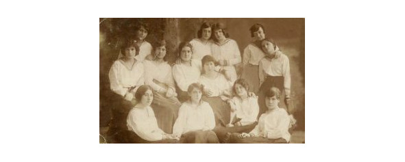 На всех снимках той поры вид у бабушки серьезный и строгий, прямая спина, горделивая осанка. Слегка улыбается бабушка только на одном снимке 1916 года (ей здесь 26 лет), изображающем группу девушек в светлых матросках.